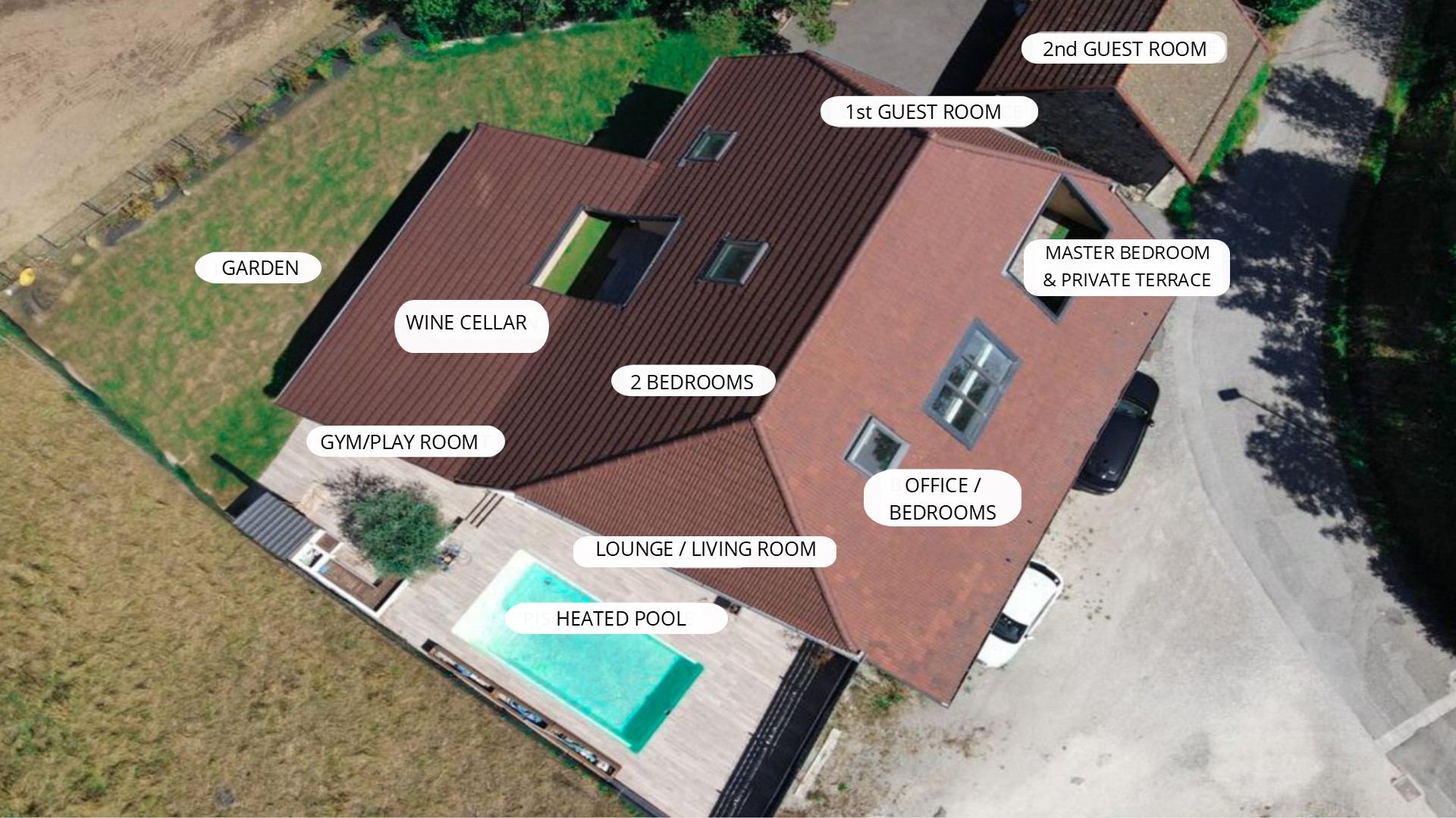 • 2 outbuildings: a 21 sqm studio that could be a Master Suite on the ground floor or a self-contained studio with its own entrance and private terrace