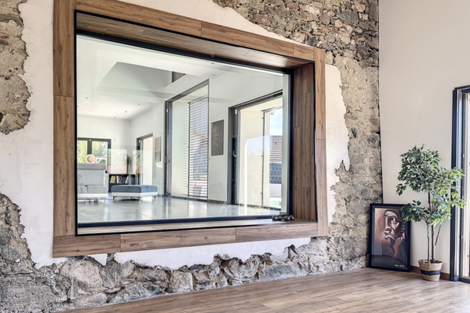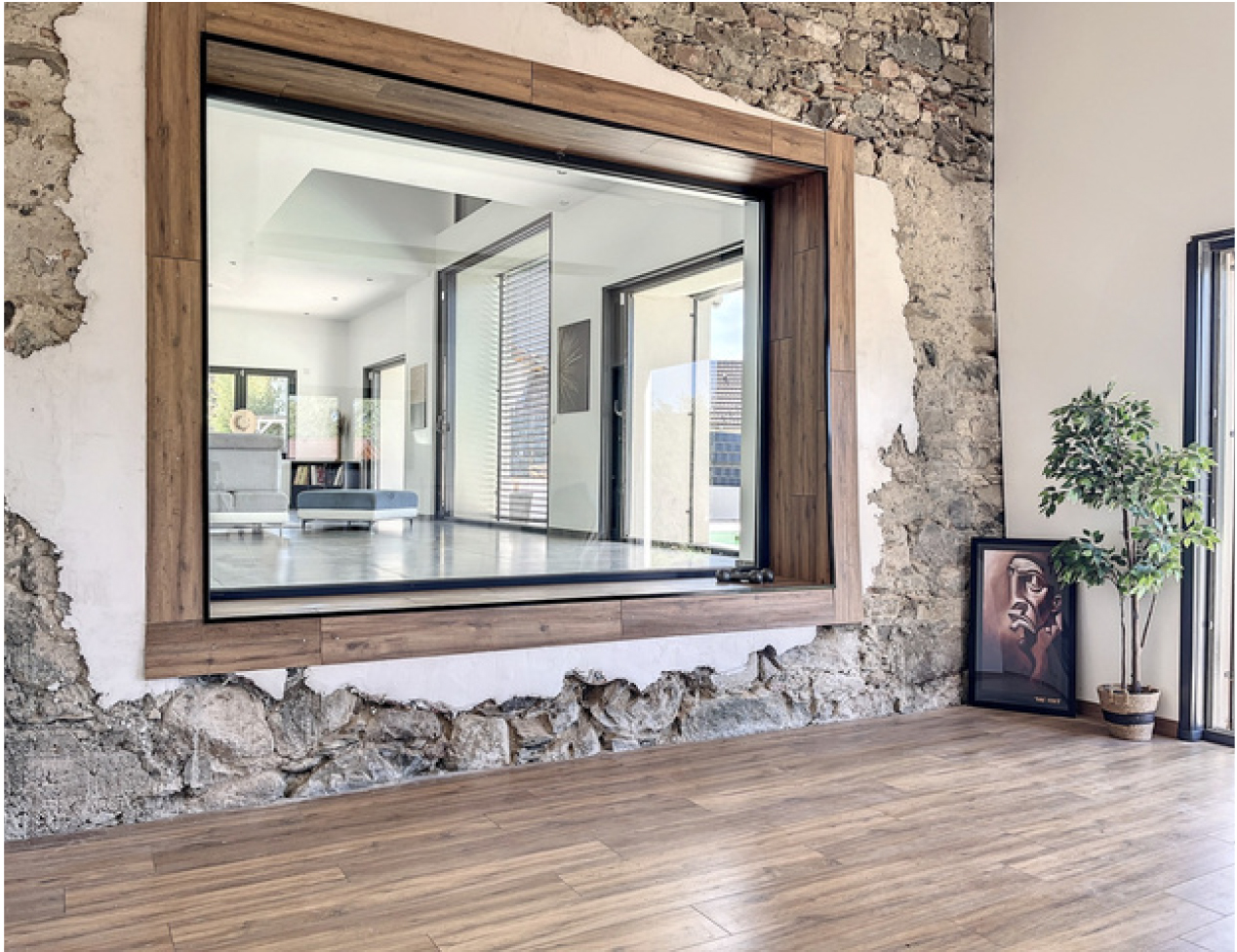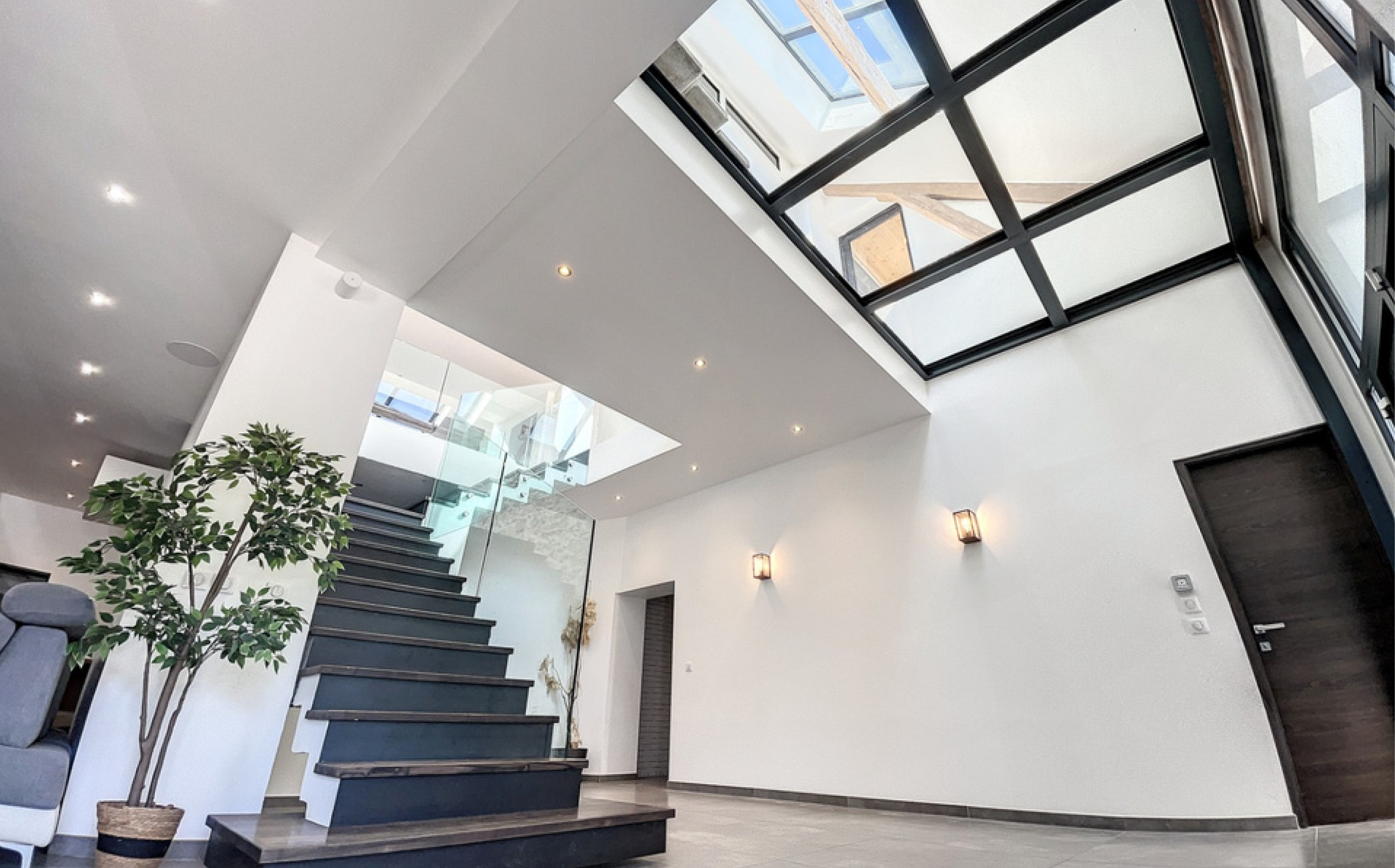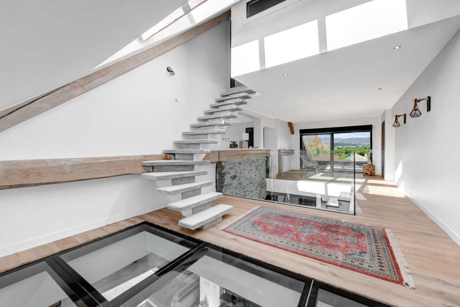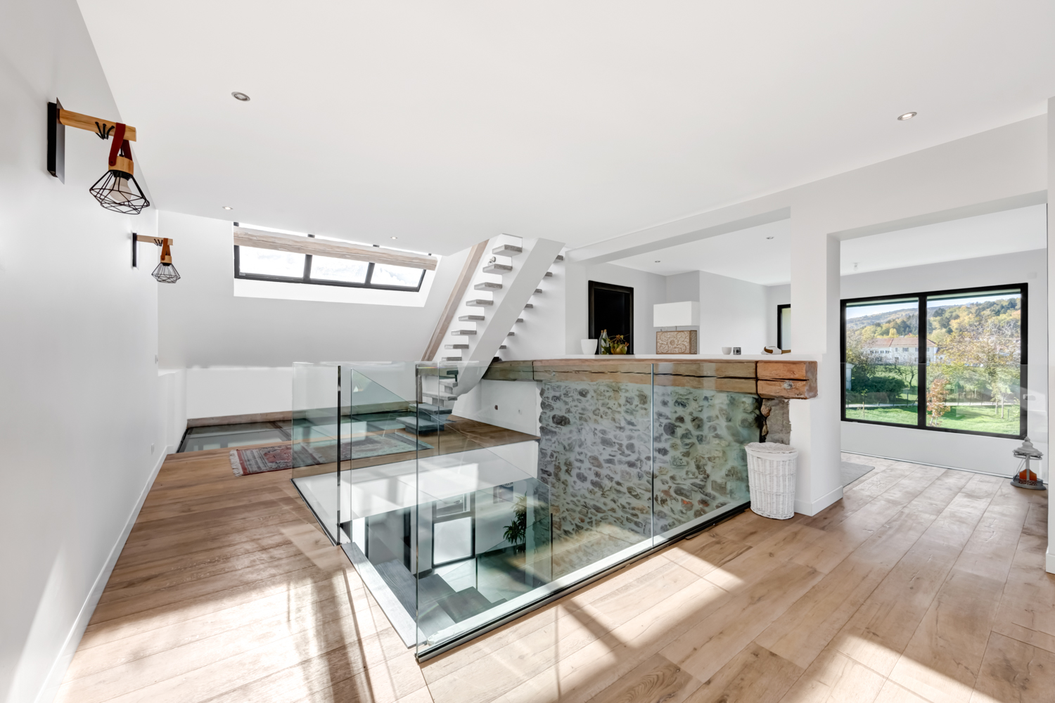Discover this beautiful 28 square metre entrance hall, where the charm of the old meets the luxury of the new. You’ll be immediately captivated by the abundance of natural light flooding into the space through an elegant glass roof. The exposed beams and original stonework add a touch of authenticity and character to the room, creating a unique atmosphere where history meets modernity.
