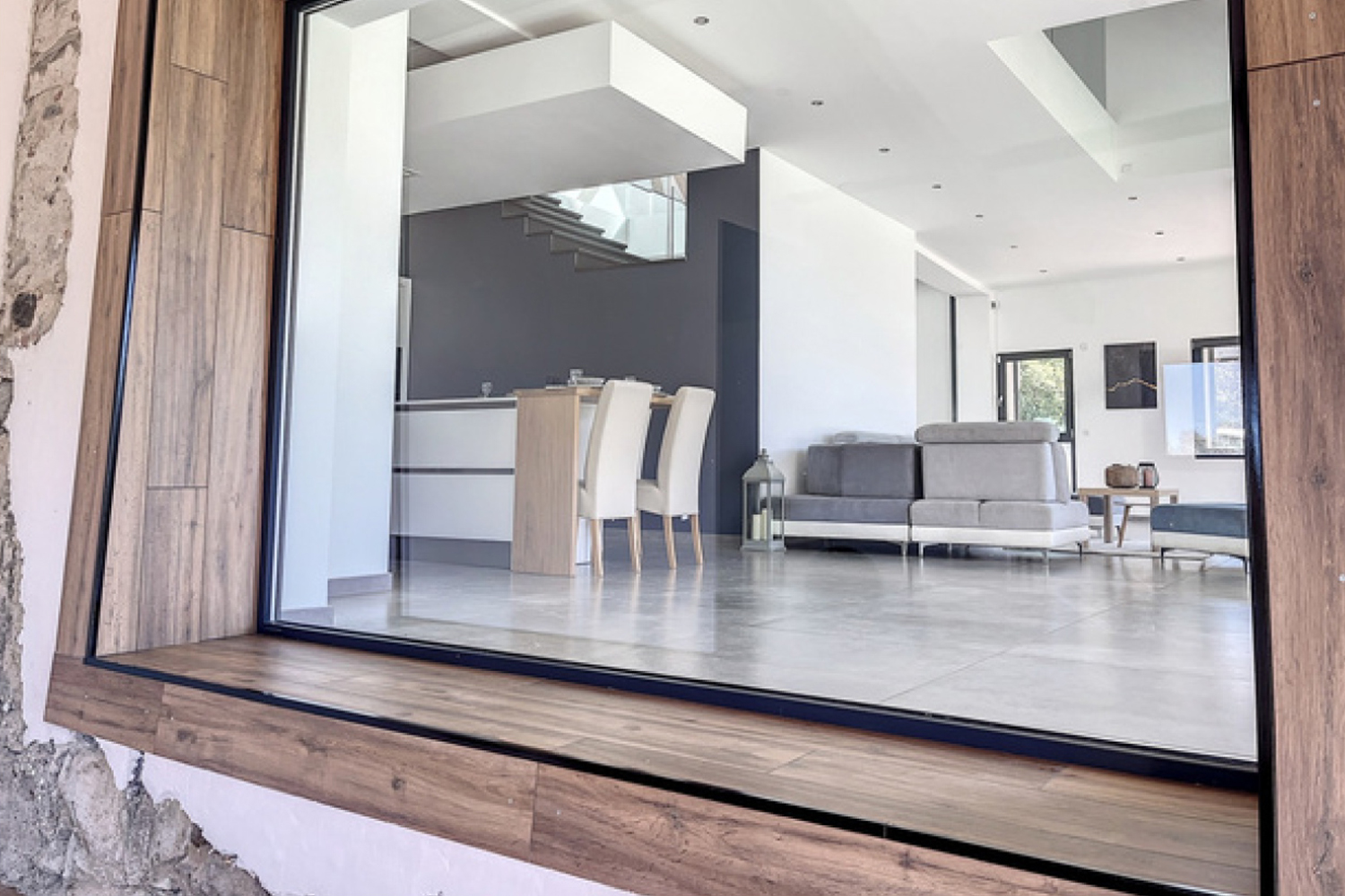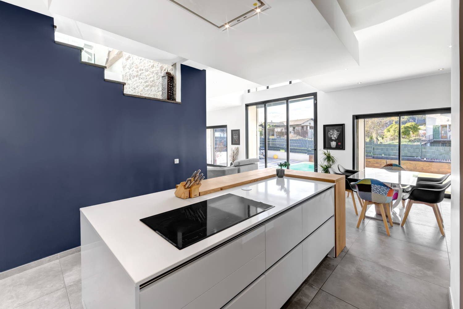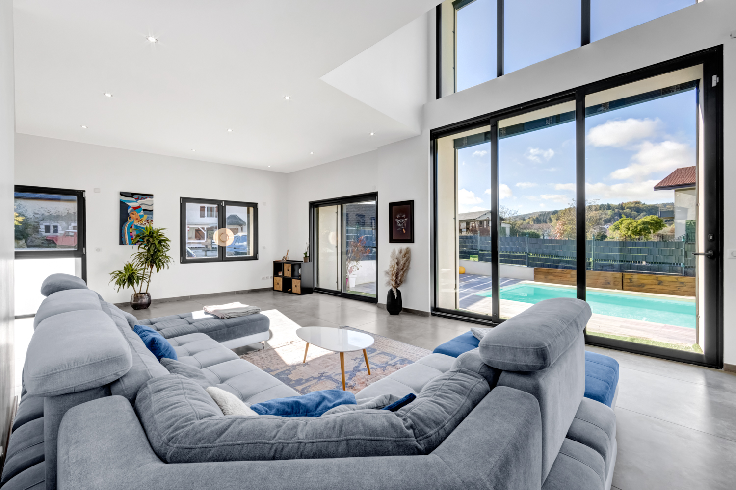 Discover this bright and spacious living room of over 66sqm, ideally designed to create a convivial atmosphere. Thanks to its sliding glass doors, it opens generously onto the terrace and swimming pool, creating a harmonious space between indoors and outdoors. The cathedral living room offers a unique experience, inviting you to make the most of your living space.
